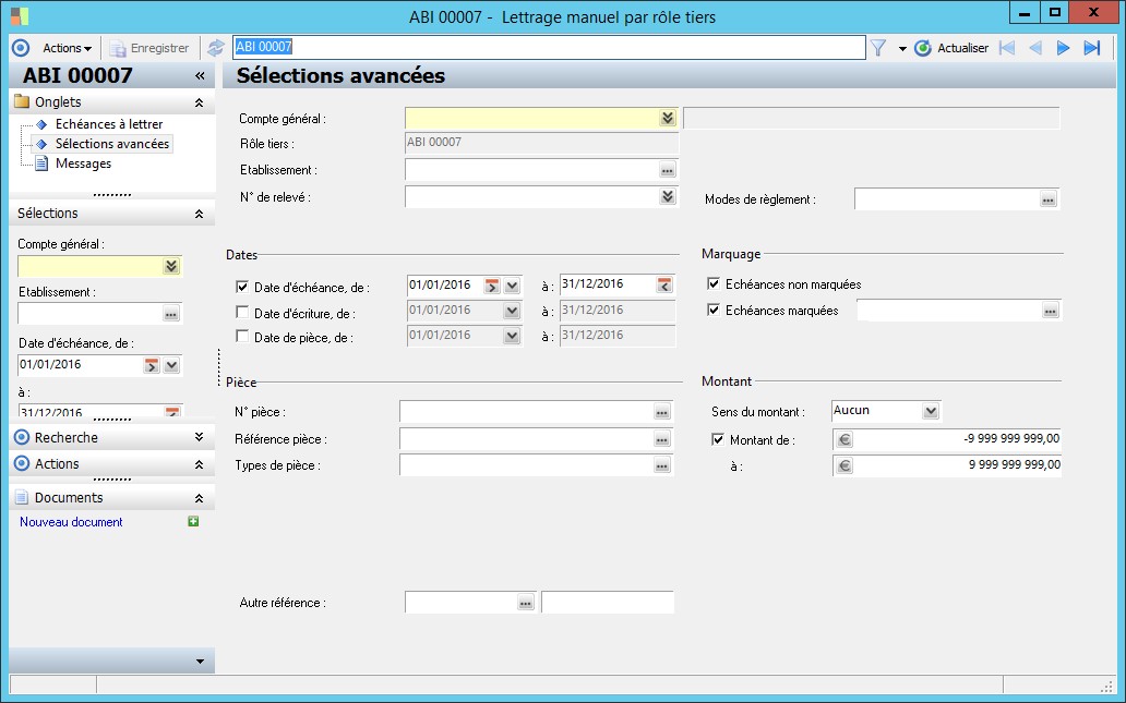 Permet d'effectuer une sélection des échéances à lettrer en fonction d'une fourchette de dates de pièce. |