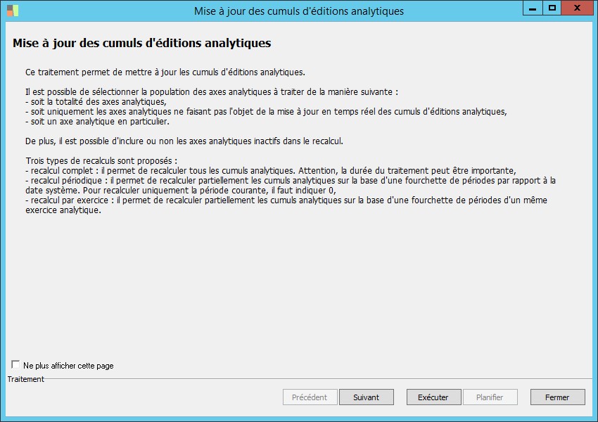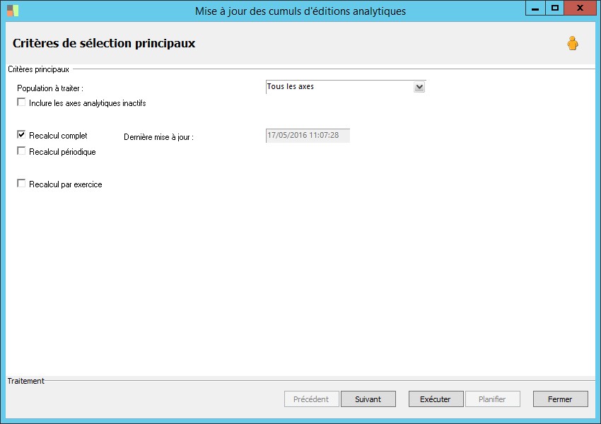 Paramètre permettant le choix d'un recalcul partiel de l'ensemble des cumuls analytiques à plat sur la base d'une sélection d'une fourchette de période d'un même exercice analytique. |