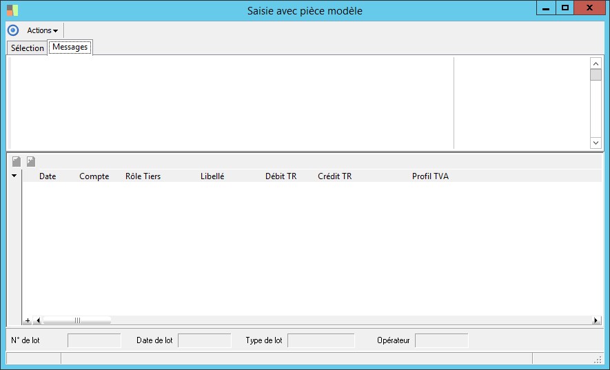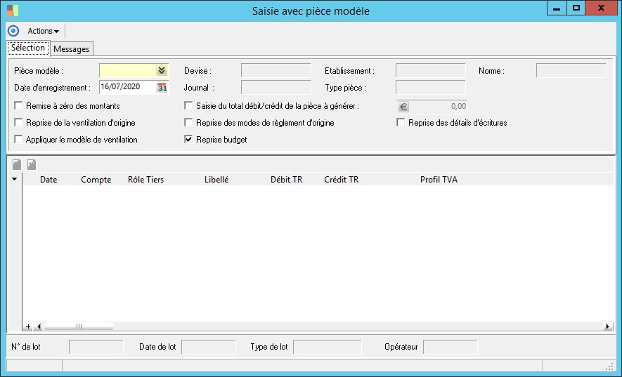 (Sage FRP 1000 Comptabilité) Menu Comptabilité > Générale > Saisie des écritures en brouillard > Exploitation > Saisie avec pièce modèle