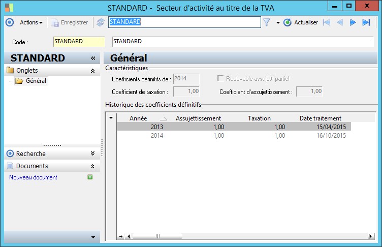 Cette zone indique le coefficient d'assujettissement correspondant au secteur d'activité TVA.La valeur du coefficient d'assujettissement doit être comprise entre 0 et 1. |