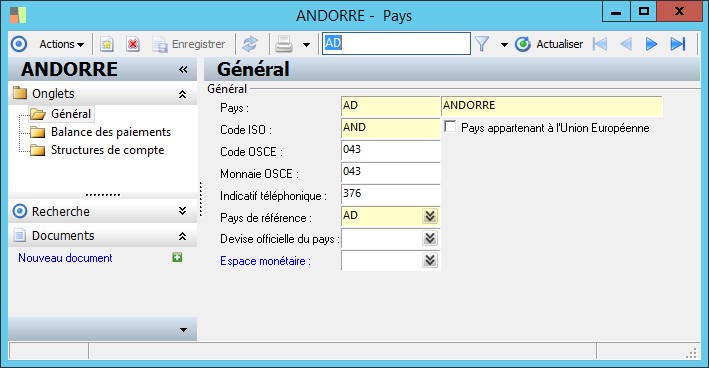 Pays de référence : Cette zone permet de renseigner le code ISO du pays selon la norme en vigueur (code ISO à 3 positions). |