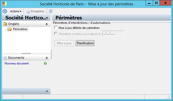 Option permettant de différer la mise à jour des périmètres d'interdictions ou d'autorisations lorsqu'un éléments des périmètres (compte, société, ...) est modifié.La mise à jour des périmètres peut se faire manuellement ou être planifiée. |