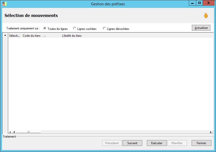 Cette zone permet d'indiquer le préfixe souhaité pour les rôles tiers de type 'Tiers Divers' à traiter.Par défaut, le préfixe est repris des paramètres de la fiche société. Sa valeur est modifiable. |