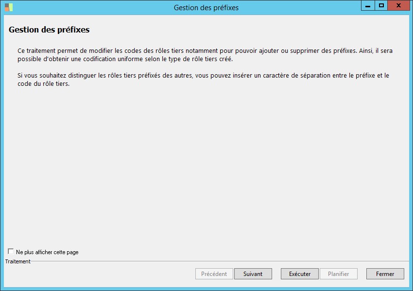 Cette zone permet d'indiquer le préfixe souhaité pour les rôles tiers de type 'Fournisseur' à traiter.Par défaut, le préfixe est repris des paramètres de la fiche société. Sa valeur est modifiable. |