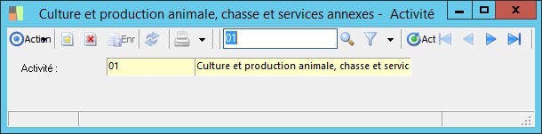 Le code permet d'identifier de manière unique une activité.Cette notion est reprise dans la fiche Société et dans la fiche Tiers. |