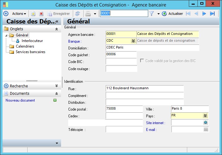 L'agence bancaire appartient à une banque. La saisie du code banque est obligatoire et identifie le code établissement. |