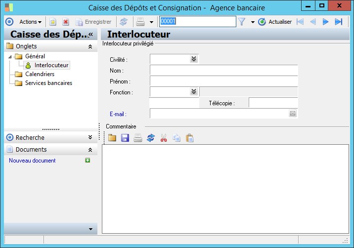 permet d'accéder à la fenêtre d'enregistrement des coordonnées de votre interlocuteur privilégié au sein de cette agence. Un seul interlocuteur peut être saisi.Présentation