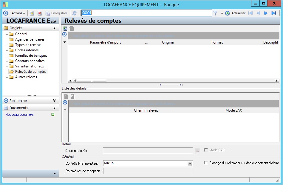 Cette option permet de contrôler l'existence des comptes bancaires lors du traitement des relevés.Si l'option est "Blocage", le traitement s'arrête si un des comptes présents dans le fichier n'est pas créé dans l'application.Si l'option est "Aucun", le traitement intègre uniquement les écritures sur les comptes existants et ignore les autres écritures. |
