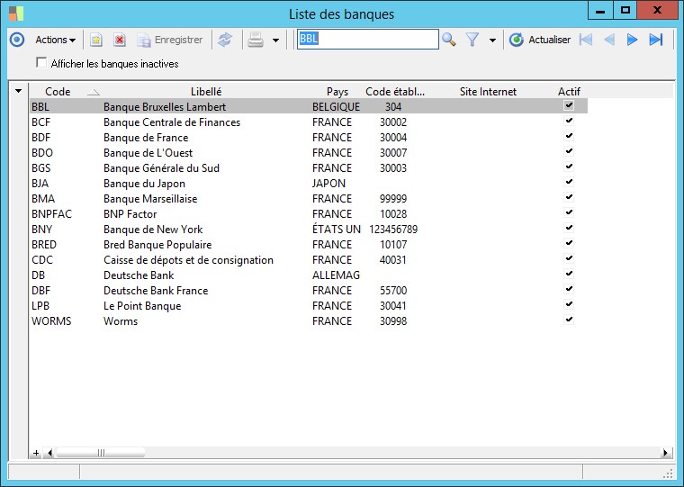 (Sage FRP 1000 Comptabilité) Menu Comptabilité Groupe > Paramètres > Banques > Liste des banques