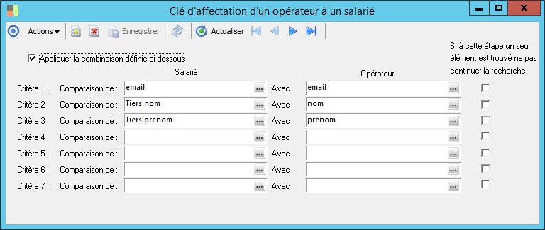 La clé permettant de rapprocher un opérateur d'un salarié est basée sur maximum 7 critèresIci le 1er critère est défini pour l'interlocuteur il sera comparé au 1er critère défini pour le salarié. |