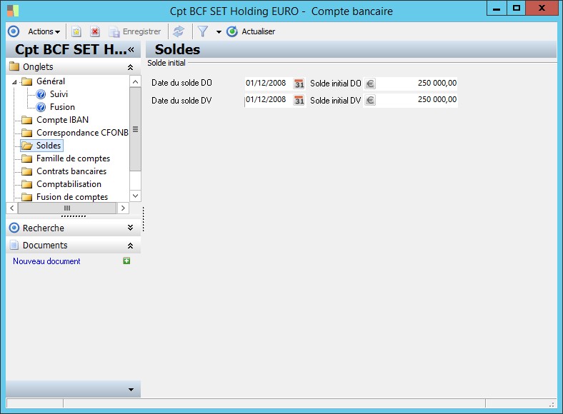 Cette zone permet de renseigner le solde initial en date d'opération du compte bancaire, soit à la création du compte bancaire, soit à la modification de la devise du compte bancaire.Cette zone est testée lors de l'importation du premier relevé bancaire afin de vérifier la cohérence des soldes. |