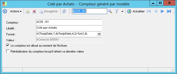 (Sage FRP 1000 Comptabilité) Menu Comptabilité Groupe > Paramètres > Compteurs > Compteur généré par modèle