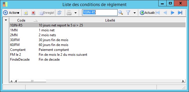 Cette fonction donne la liste et permet d'enregistrer les différentes conditions de règlement utilisées dans le programme.