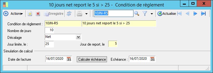 - si la valeur 0 (zéro) a été laissée dans ces mêmes zones, le programme considère qu'il s'agit d'un règlement comptant et ne propose aucun jour de tombée.