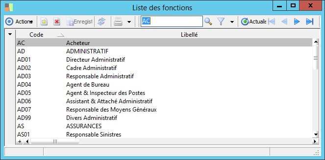 La liste des fonctions apparaît en sélectionnant la commande Paramètres / Société / Fonctions .