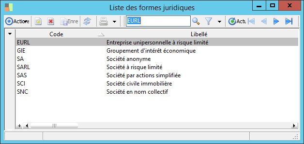 Cette fenêtre affiche la liste des formes juridiques des sociétés. Elle permet de les créer, de les consulter, de les modifier et de les supprimer si nécessaire.
