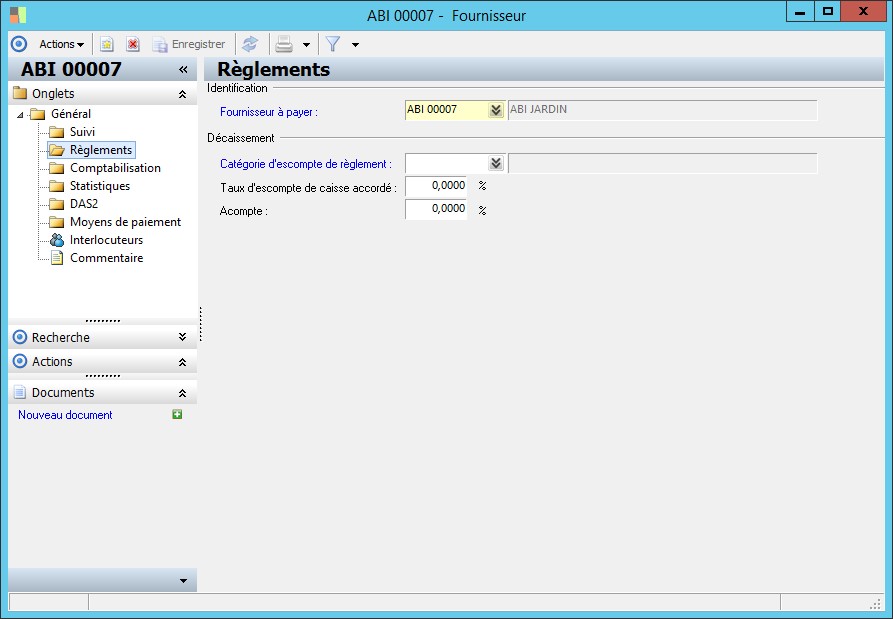 Cette information permet de définir sur le client ou fournisseur l'application d'un taux d'escompte de règlement fonction d'un nombre de jours d'avance du reglement par rapport à l'échéance. Une catégorie d'escompte de règlement regroupe plusieurs dates de début de validité définissant chacune plusieurs de taux d'escompte à raison d'un par seuil de jours d'avance (conditions d'escompte valable à partir d'une date donnée). |
