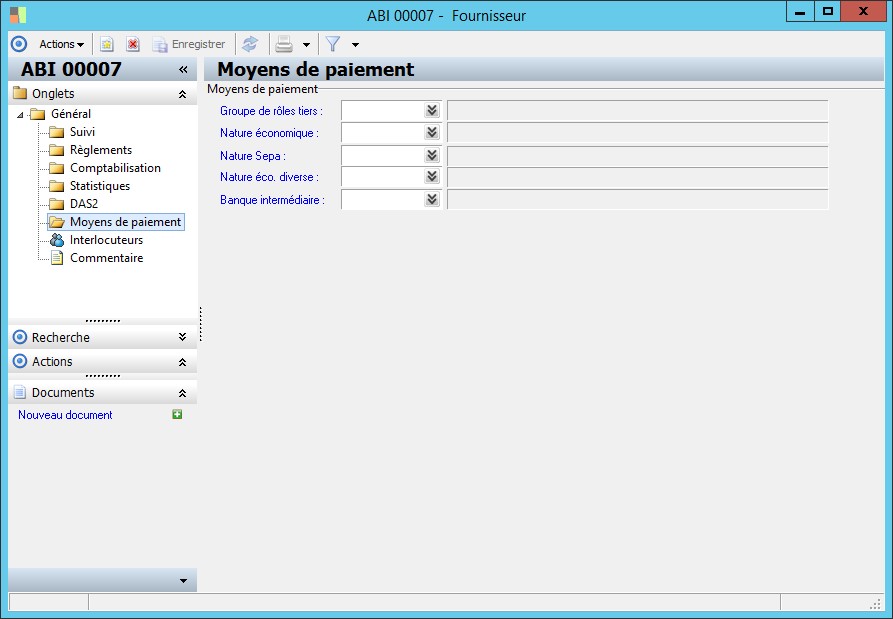 Lorsqu'un groupe de relevé est indiqué dans la fiche du rôle tiers, un mode de règlement des relevés doit être indiqué. Il s'agit du mode de règlement qui sera associé aux relevés générés. |