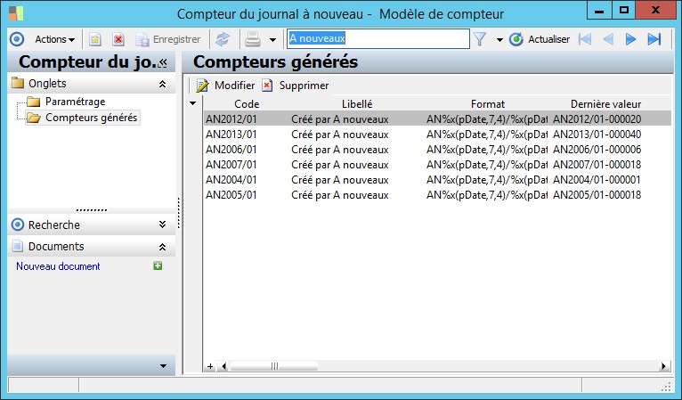 Compteurs générés du modèle de compteur précédemment créé. On sélectionne la ligne du compteur généré et on lance la commande