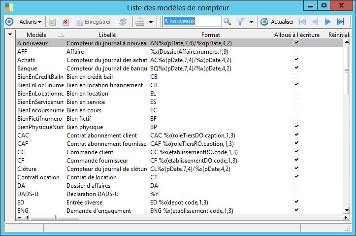 Le format d'un compteur permet de paramètrer la structure de la numérotation. Les formats peuvent être paramétrés avec du texte, une date, une valeur numérique ou une valeur alphanumérique. Les formats de compteurs proposés par défaut sont :