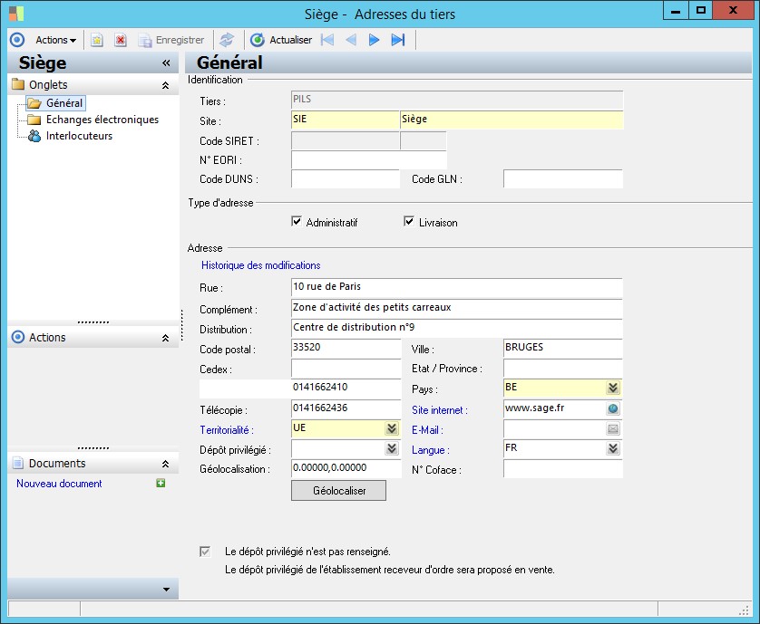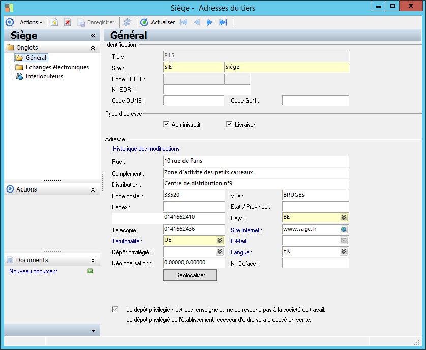 Le code permet d'identifier de manière unique un site.Au niveau de la fiche tiers, on peut gérer différents sites.Quand on attribue un rôle à un tiers, on indique le site privilégié du rôle tiers.