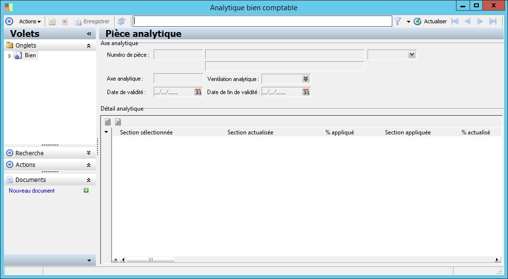 Tant que la pièce analytique n'est pas validée, la section analytique peut être actualisée :- par toute modification intervenant sur une information du bien, qui participe à la constitution de la section analytique (quand l'axe analytique lié est en constitution automatique),- ou par une modification de la section analytique saisie (quand l'axe analytique lié n'est pas en constitution automatique). |