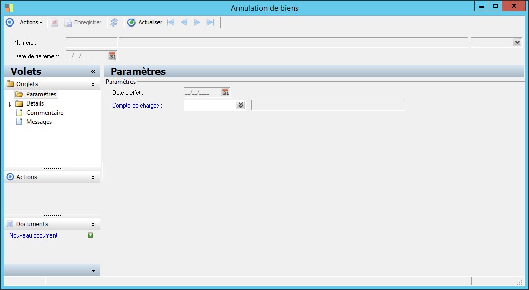 (Sage FRP 1000 Comptabilité) Menu Immobilisations > Suivi comptable > Biens > Annulation de biens