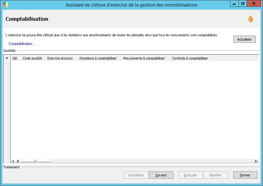 Cette zone indique s'il existe des dotations aux amortissements restant à comptabiliser sur l'exercice (si cette case est cochée, il n'est pas possible de clôturer l'exercice). |