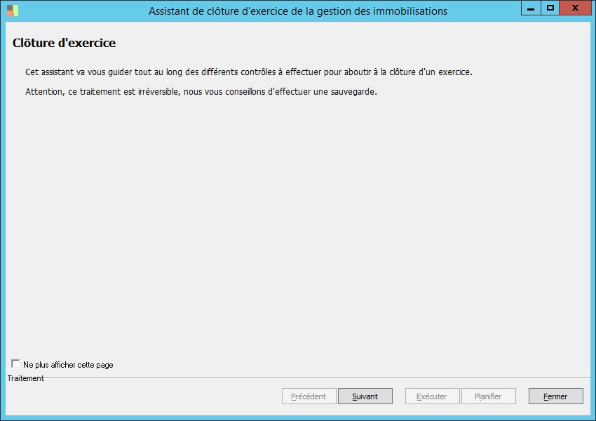 (Sage FRP 1000 Comptabilité) Menu Immobilisations > Arrêtés comptables > Assistant de clôture d'exercice de la gestion des immobilisations
