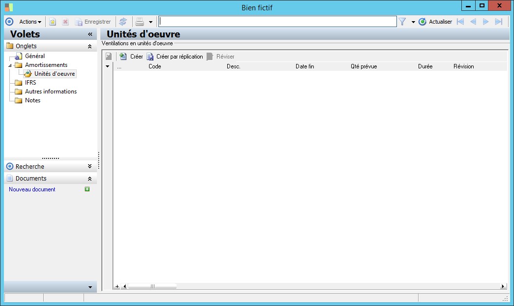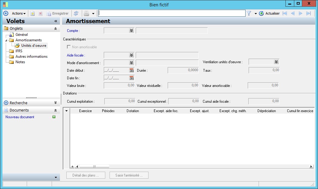 Cette zone permet de renseigner un plan de ventilation en Unités d'Oeuvre. Elle est accessible si le mode d'amortissement est de type fonctionnel. |
