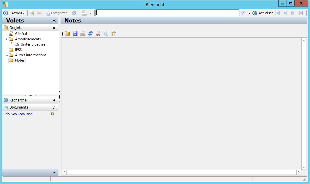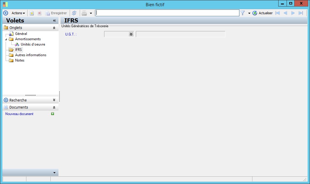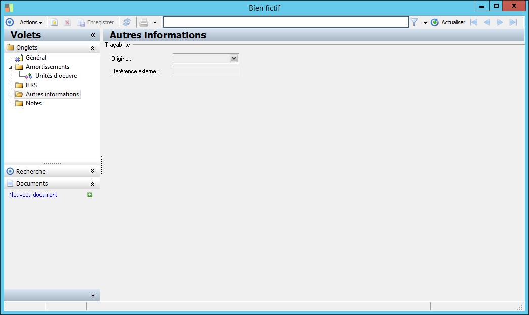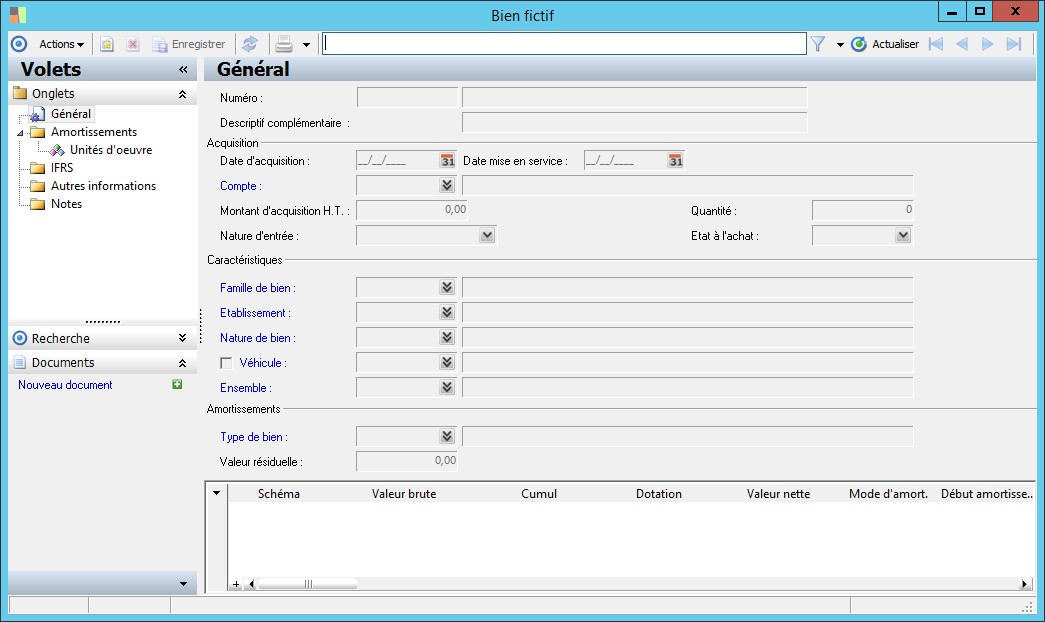 (Sage FRP 1000 Comptabilité) Menu Immobilisations > Suivi comptable > Biens > Bien fictif