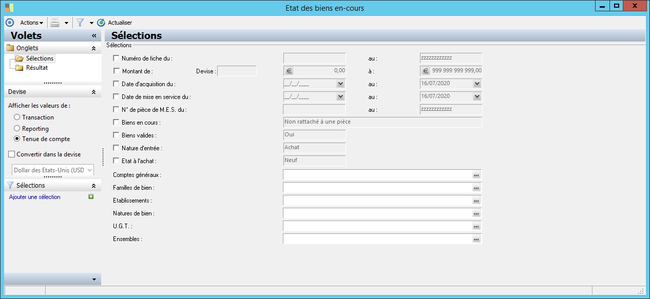 Ce paramètre permet d'effectuer un choix sur l'état du bien en-cours, entre les valeurs suivantes :Non rattaché à une pièce : Le bien en-cours n'est pas rattaché à une pièce de mise en service.Attaché à une pièce : Le bien en-cours est rattaché à une pièce de mise en service qui n'est pas valide.Mis en service : La pièce de mise en service est valide, le bien en service est créé. |