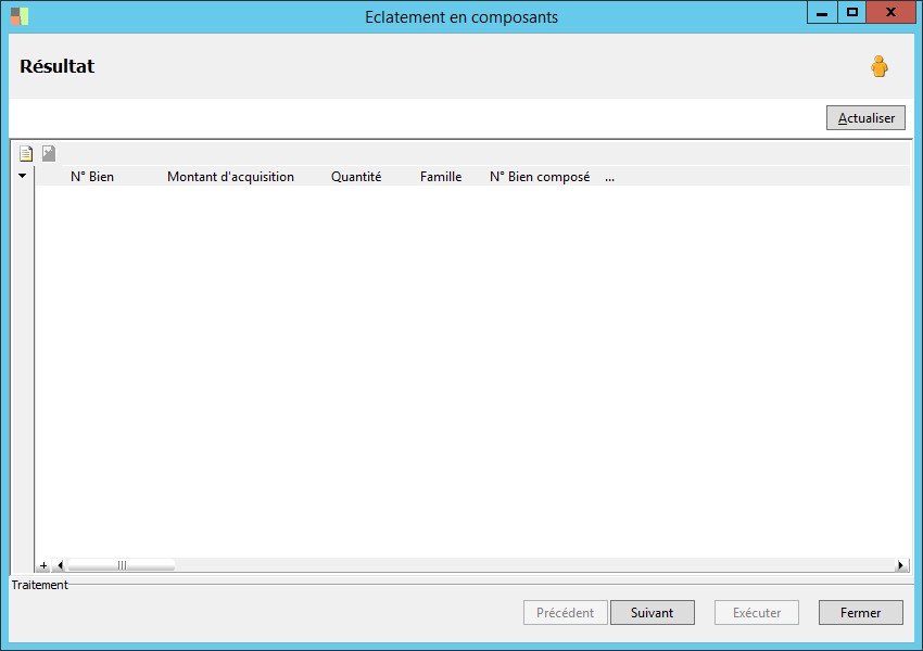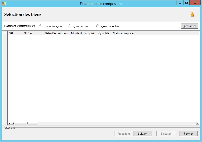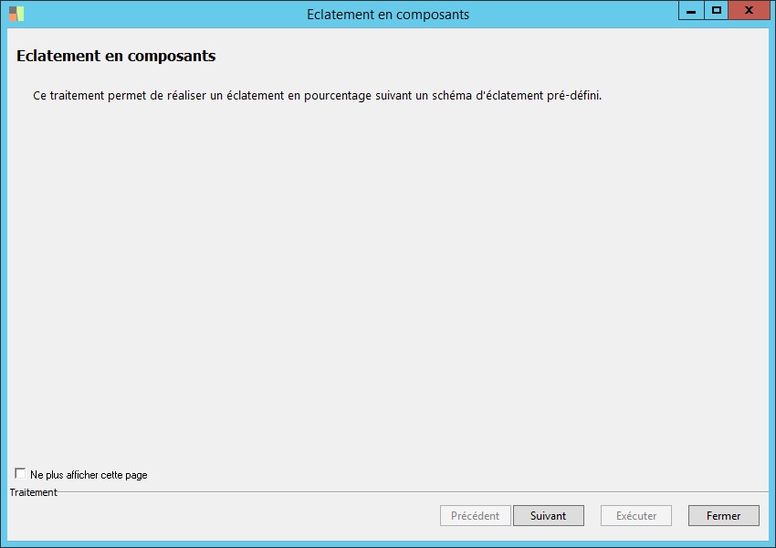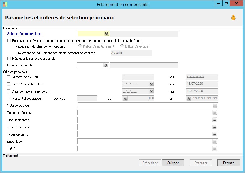 (Sage FRP 1000 Comptabilité) Menu Immobilisations > Suivi comptable > Eclatement > Eclatement en composants