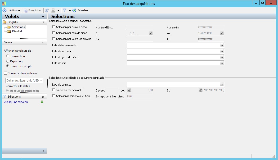 (Sage FRP 1000 Comptabilité) Menu Immobilisations > Acquisitions > Etat des acquisitions