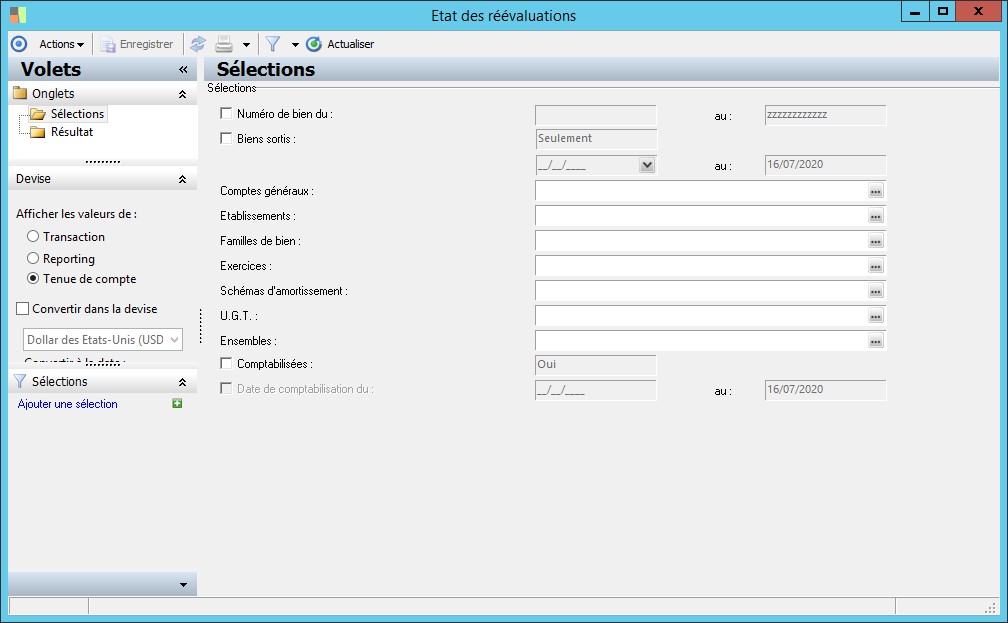 (Sage FRP 1000 Comptabilité) Menu Immobilisations > Suivi comptable > Evaluation > Etat des réévaluations