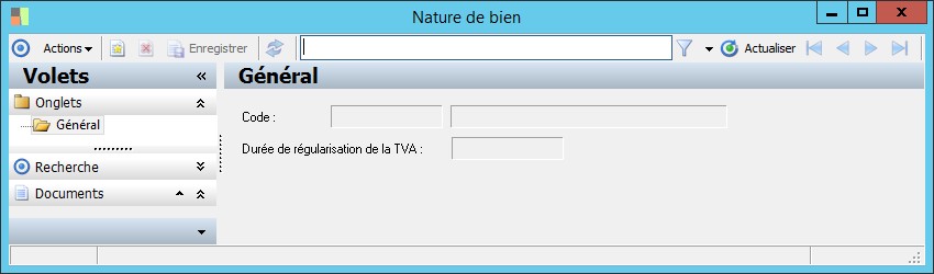 (Sage FRP 1000 Comptabilité) Menu Immobilisations > Fichiers de base > Immobilisations > Nature de bien