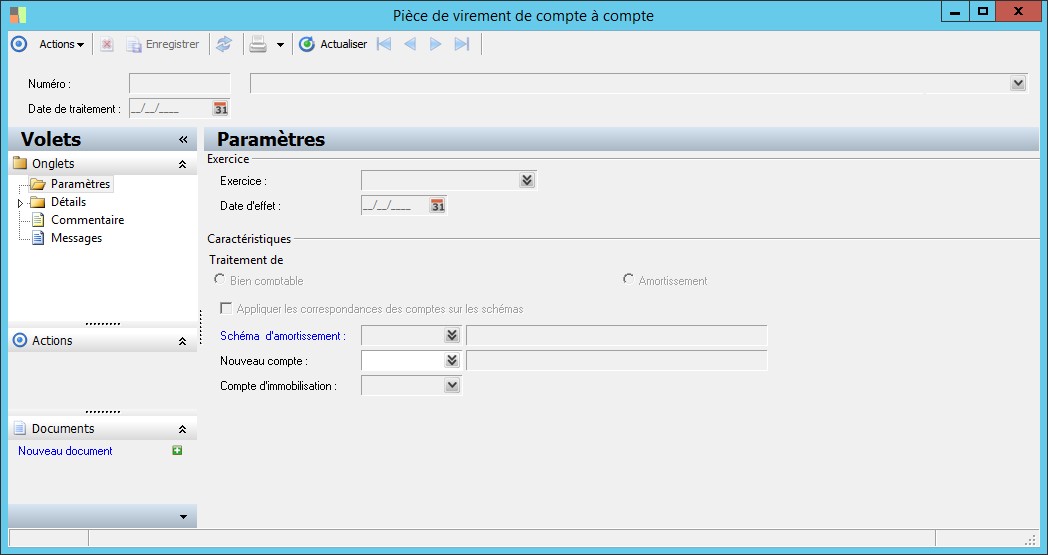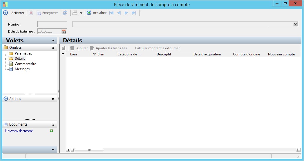 (Sage FRP 1000 Comptabilité) Menu Immobilisations > Suivi comptable > Biens > Pièce de virement de compte à compte