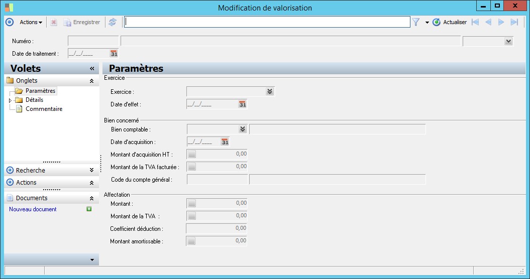 (Sage FRP 1000 Comptabilité) Menu Immobilisations > Suivi comptable > Biens > Modification de valorisation