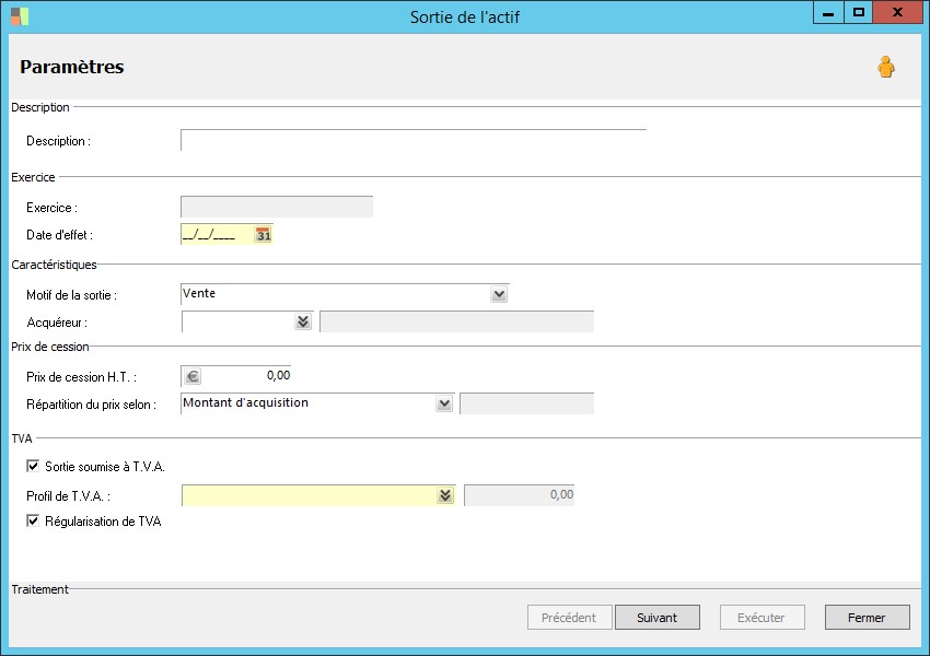 Cette zone permet de renseigner le prix de cession hors taxe lorsque le motif de sortie correspond à une vente ou une cession intra-groupe. |