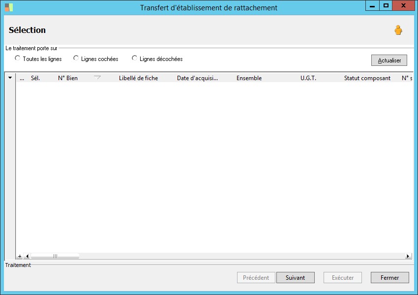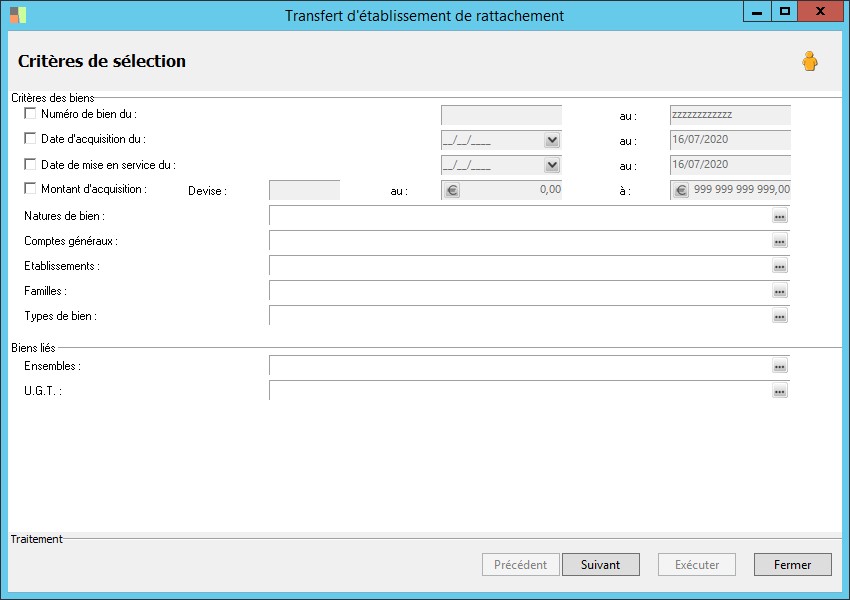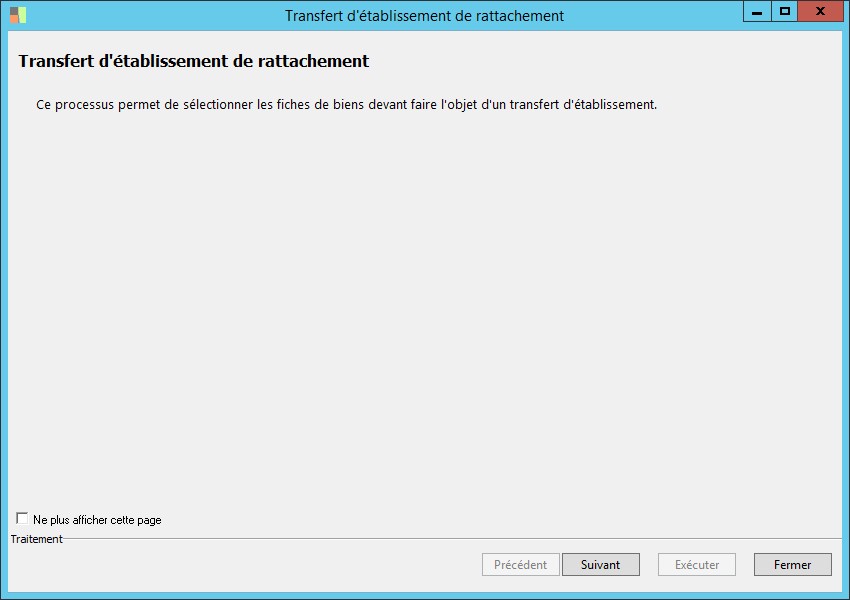 (Sage FRP 1000 Comptabilité) Menu Immobilisations > Suivi comptable > Etablissement > Transfert d'établissement de rattachement