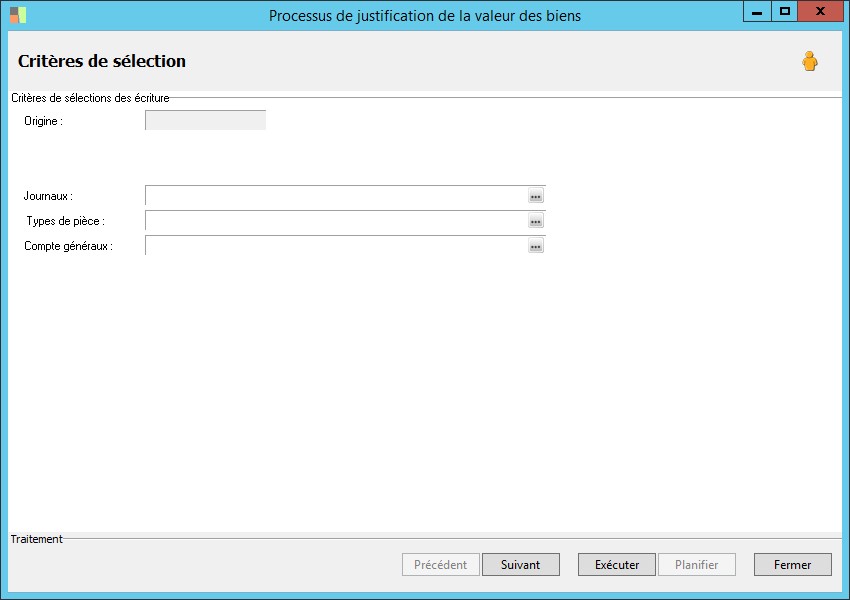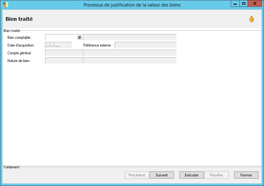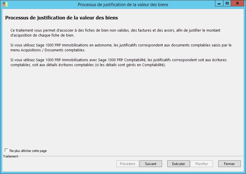 (Sage FRP 1000 Comptabilité) Menu Immobilisations > Suivi comptable > Biens > Processus de justification de la valeur des biens