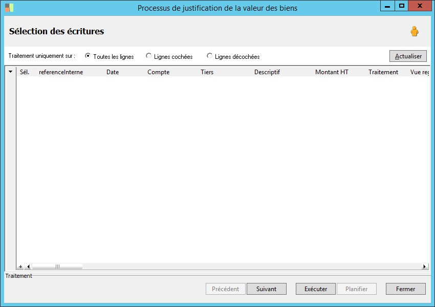 Cette zone permet de sélectionner le traitement à affecter à la ligne de facture.Aucun : la ligne ne sera pas traitéeCréation : la ligne créera un bienModification : la ligne modifiera un bien |