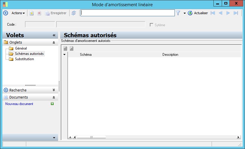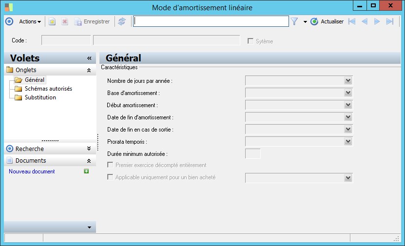 (Sage FRP 1000 Comptabilité) Menu Immobilisations > Fichiers de base > Amortissements > Mode d'amortissement linéaire