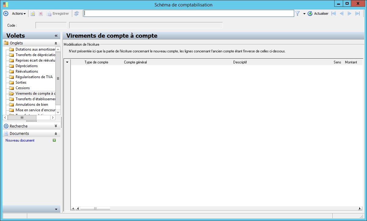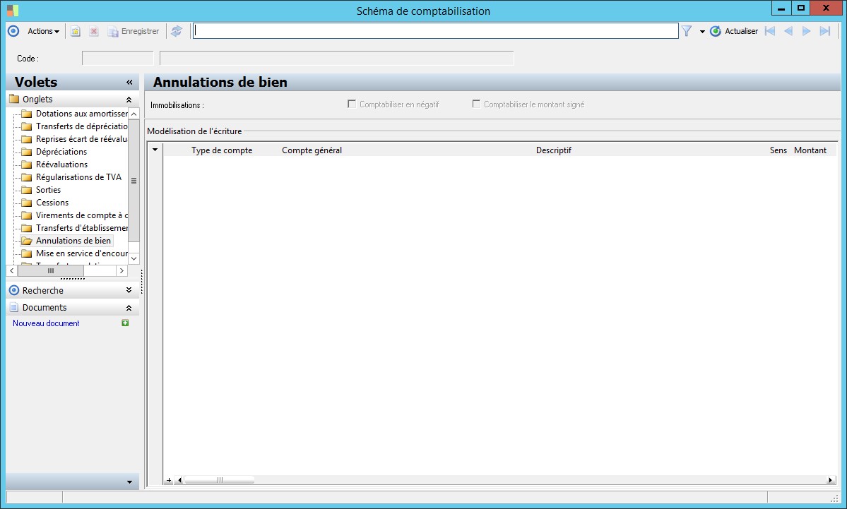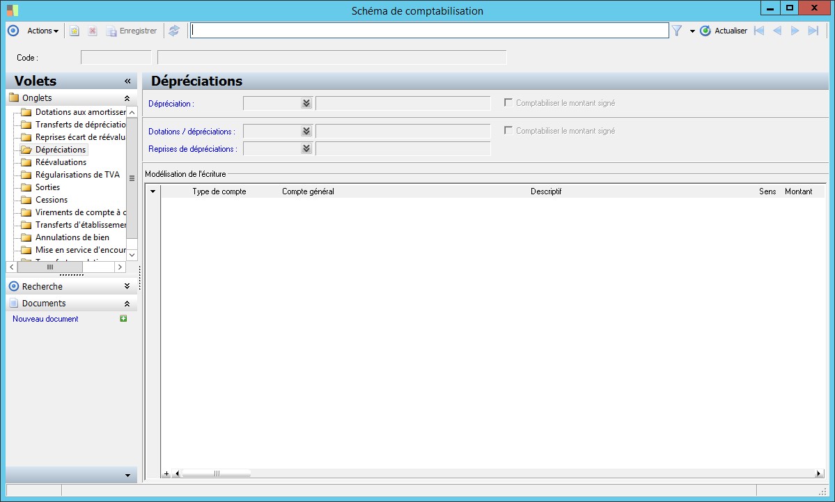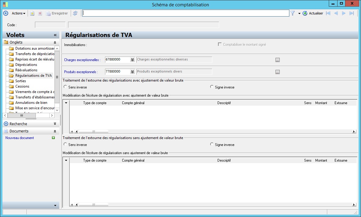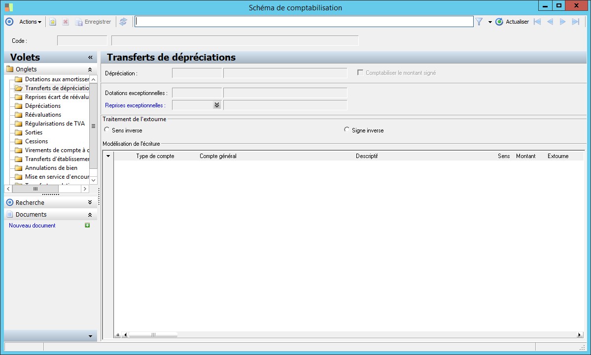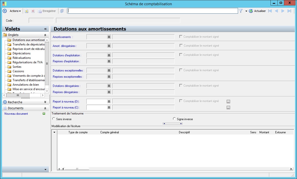 Attention, vous devez impérativement renseigner tous les comptes d'un schéma de comptabilisation, y compris ceux qui n'apparaissent pas comme étant obligatoires. Ceci est nécessaire pour le traitement de comptabilisation des dotations et mouvements. |