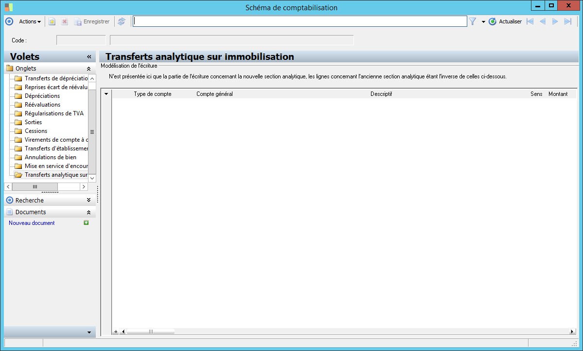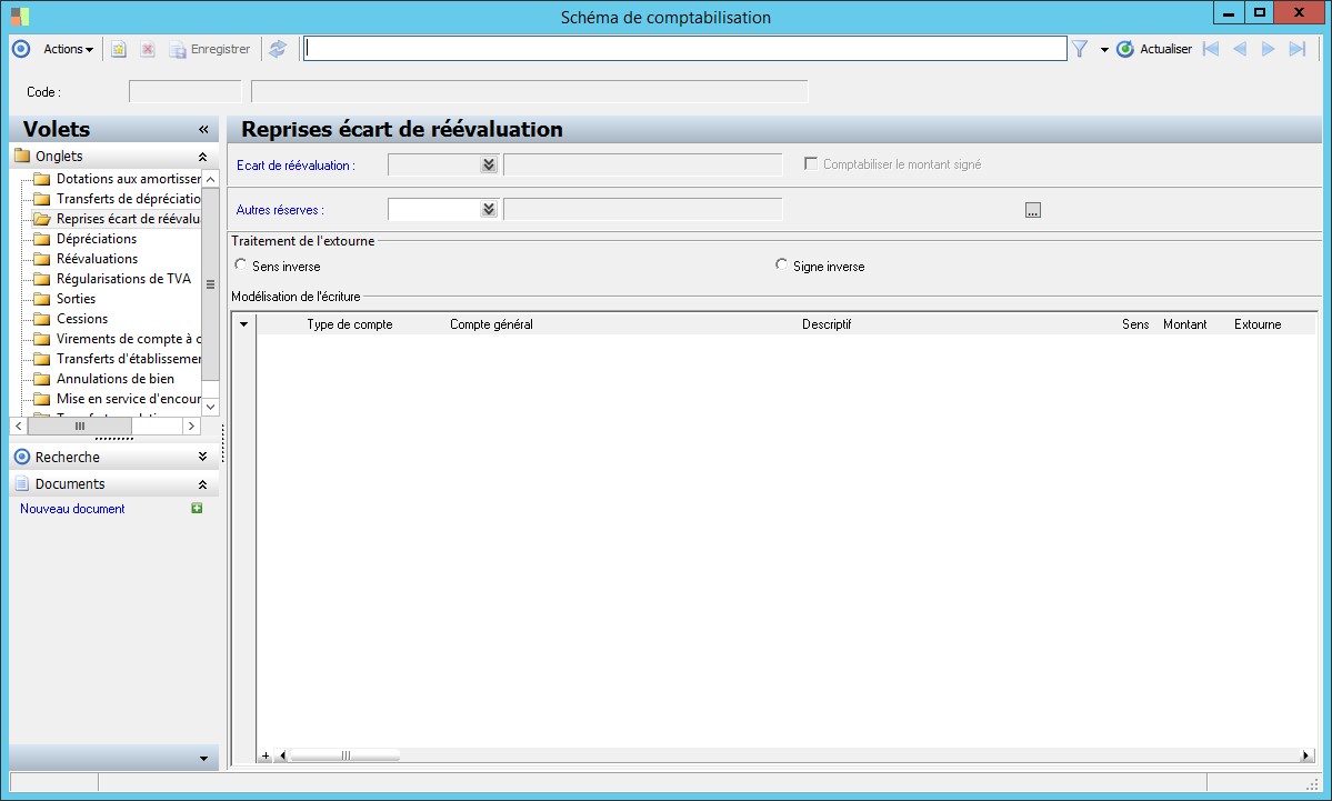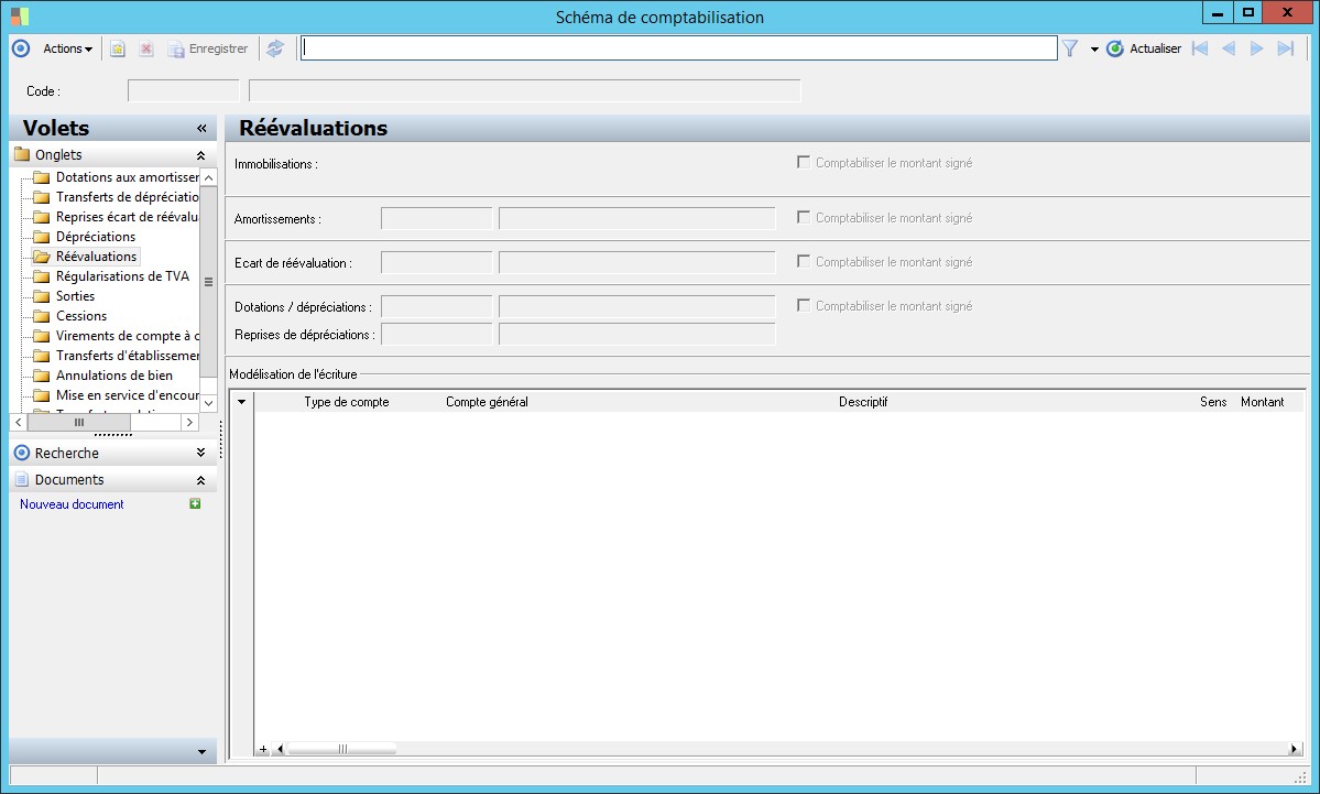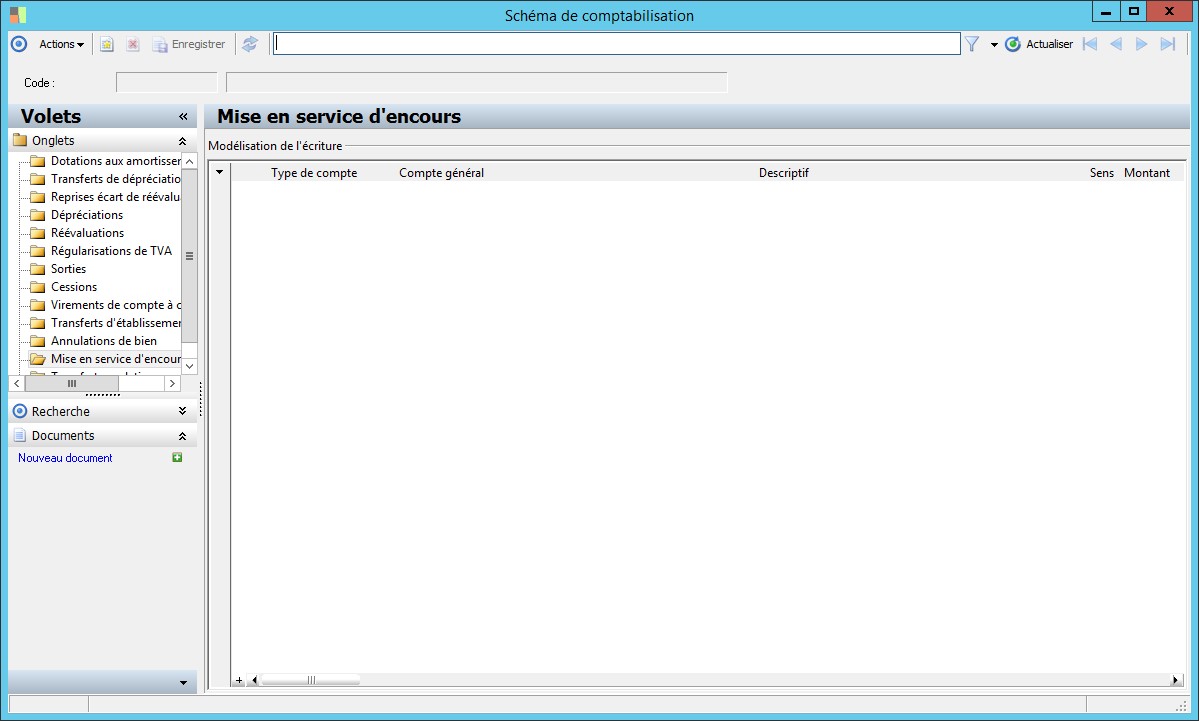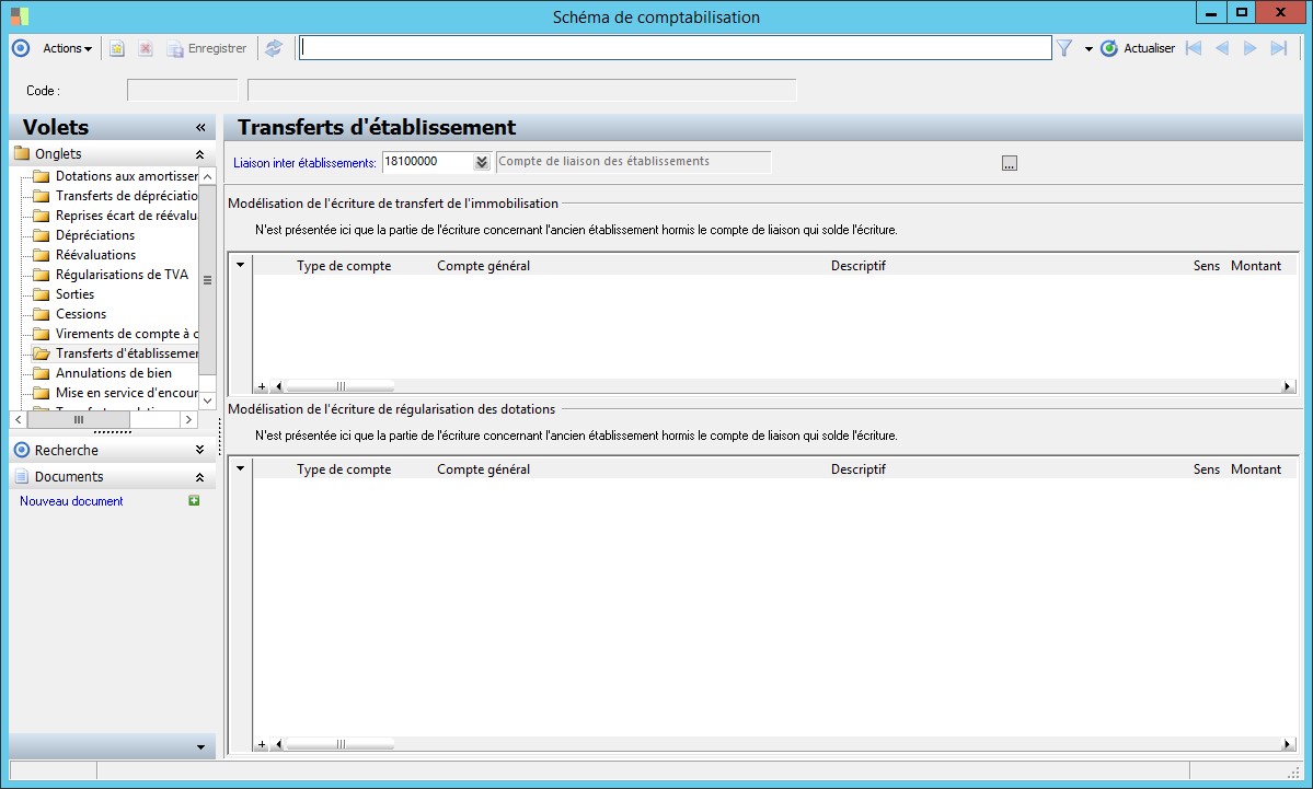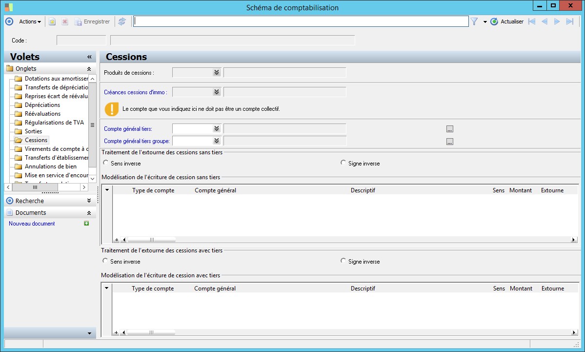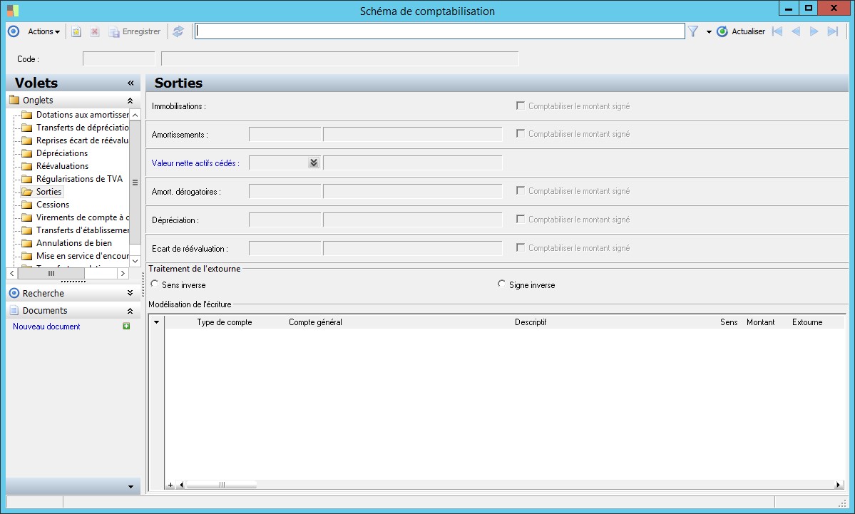 Attention, vous devez impérativement renseigner tous les comptes d'un schéma de comptabilisation, y compris ceux qui n'apparaissent pas comme étant obligatoires. Ceci est nécessaire pour le traitement de comptabilisation des dotations et mouvements. |