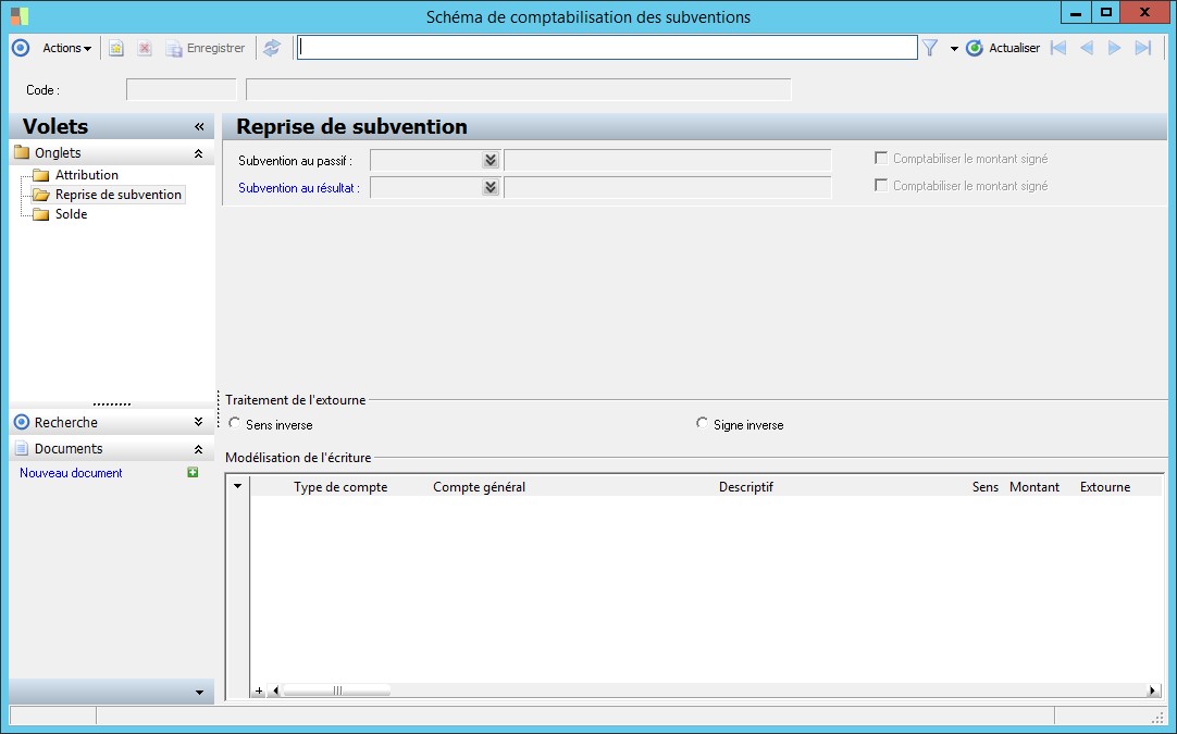 (Sage FRP 1000 Comptabilité) Menu Comptabilité Groupe > Fichiers de base > Schéma de comptabilisation des subventions