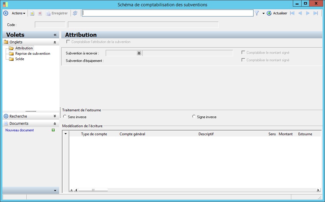 Attention, vous devez impérativement renseigner tous les comptes d'un schéma de comptabilisation, y compris ceux qui n'apparaissent pas comme étant obligatoires. Ceci est nécessaire pour le traitement de comptabilisation des subventions. |
