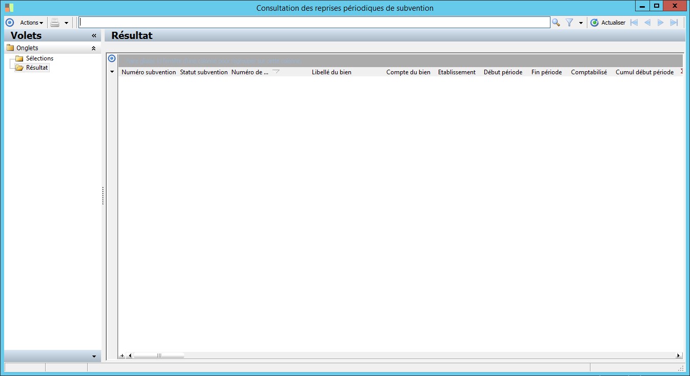 (Sage FRP 1000 Comptabilité) Menu Immobilisations > Restitutions > Consultation des reprises périodiques de subvention