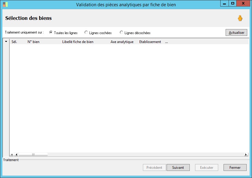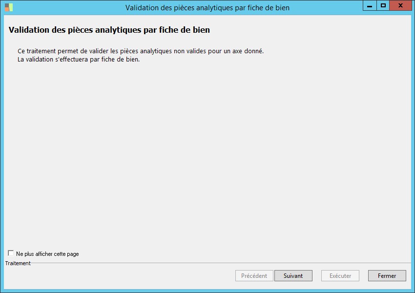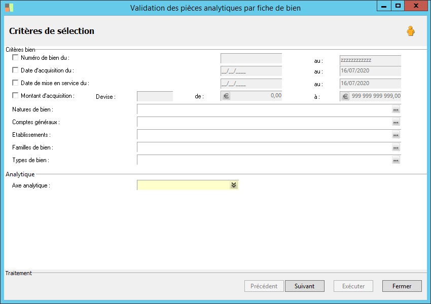 (Sage FRP 1000 Comptabilité) Menu Immobilisations > Suivi comptable > Analytique > Validation des pièces analytiques par fiche de bien