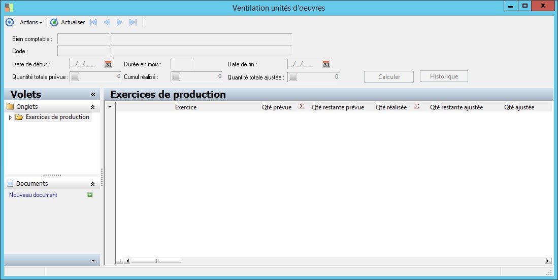 Si le plan de ventilation débute sur un exercice antérieur à l'exercice en cours, les exercices antérieurs seront représentés sur une seule et même ligne. Dans ce cas il faut saisir un cumul d'unités d'?uvre prévues et réalisés global à ces exercices antérieurs.